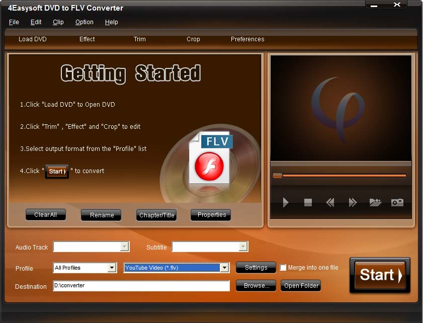 With the adoption of powerful DVD to FLV encoder, you can easily convert DVD to FLV video with rich options such as customizing file size, DVD movie trimming, subtitle selection, audio track selection and so forth.