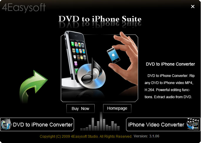 4Easysoft DVD to iPhone Suite integrats DVD to iPhone Converter and iPhone Video Converter into the single tool and possesses the double function of ripping DVD and converting video. It can rip DVD to MPEG-4 (.mp4), H.264 (.mp4), MOV, MP3, AAC, AIFF, M4A, WAV for iPhone, iPhone OS 3.0. For the Video Converter part, converting any files to iPhone video and extract audio from video to convert to audio formats.