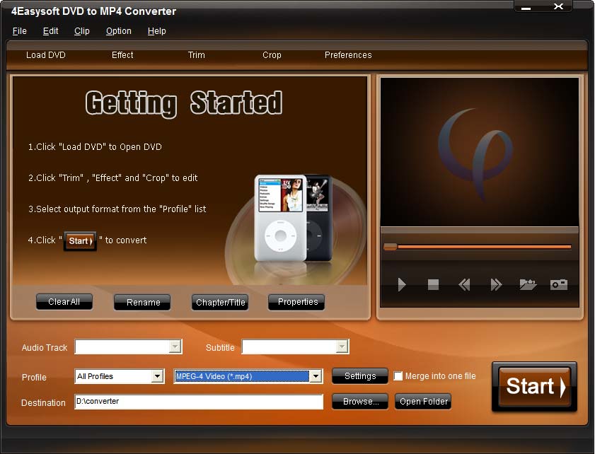 DVD to MP4 Converter symbolizes as MP4 players' cooperator software, since this DVD to MP4 Converter supports most MP4 players. It is also commonly used to extract audio from DVDs as AAC, AC3, AIFF, AMR audio. It is simple to rip one segment of your DVD, trim, crop, merge DVD videos, select audio track and subtitle, even adjust the DVD video/audio settings and more.