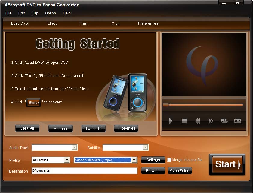 DVD to Sansa Converter is the first and best DVD to Sandisk Sansa ripper software which could convert DVD to Sansa video and audio formats, such as MP4, AVI, MP3, WAV and support all the Sandisk player series, and also compatible with iPod, iPhone, PSP, Zune, Sony, Archos, etc. So you could enjoy your favorite movie with the wonderful Sansa video or music player any time and any where.