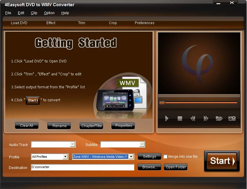 DVD to WMV Converter was built to convert DVD to WMV, DVD to HD WMV, and rip DVD to WMA, MP3 for the playback on Zune, Zune 2, Xbox 360, Gphone, Dell player, General Pocket PC, Archos, iRiver, etc. This DVD to WMV Converter also makes it easy to extract audio from DVDs to WMA, MP3 with ease.